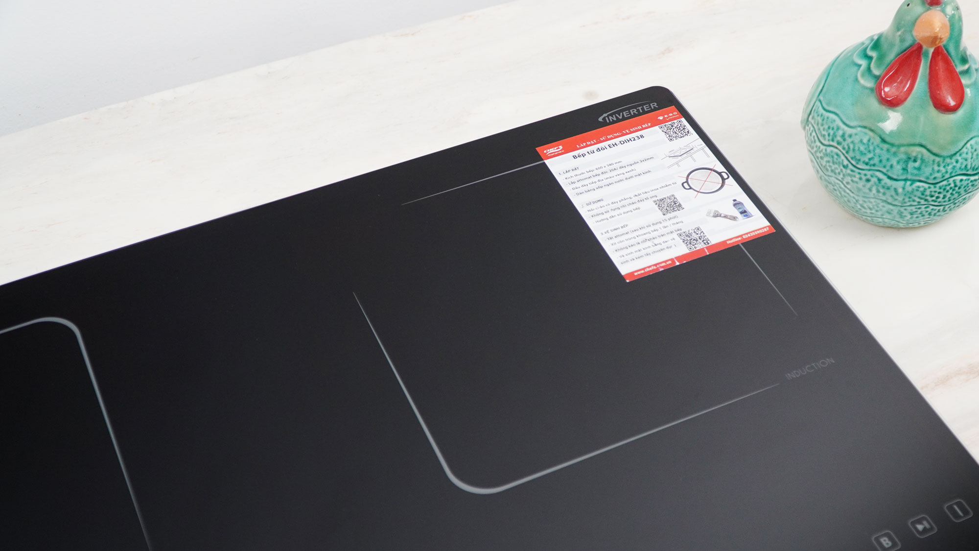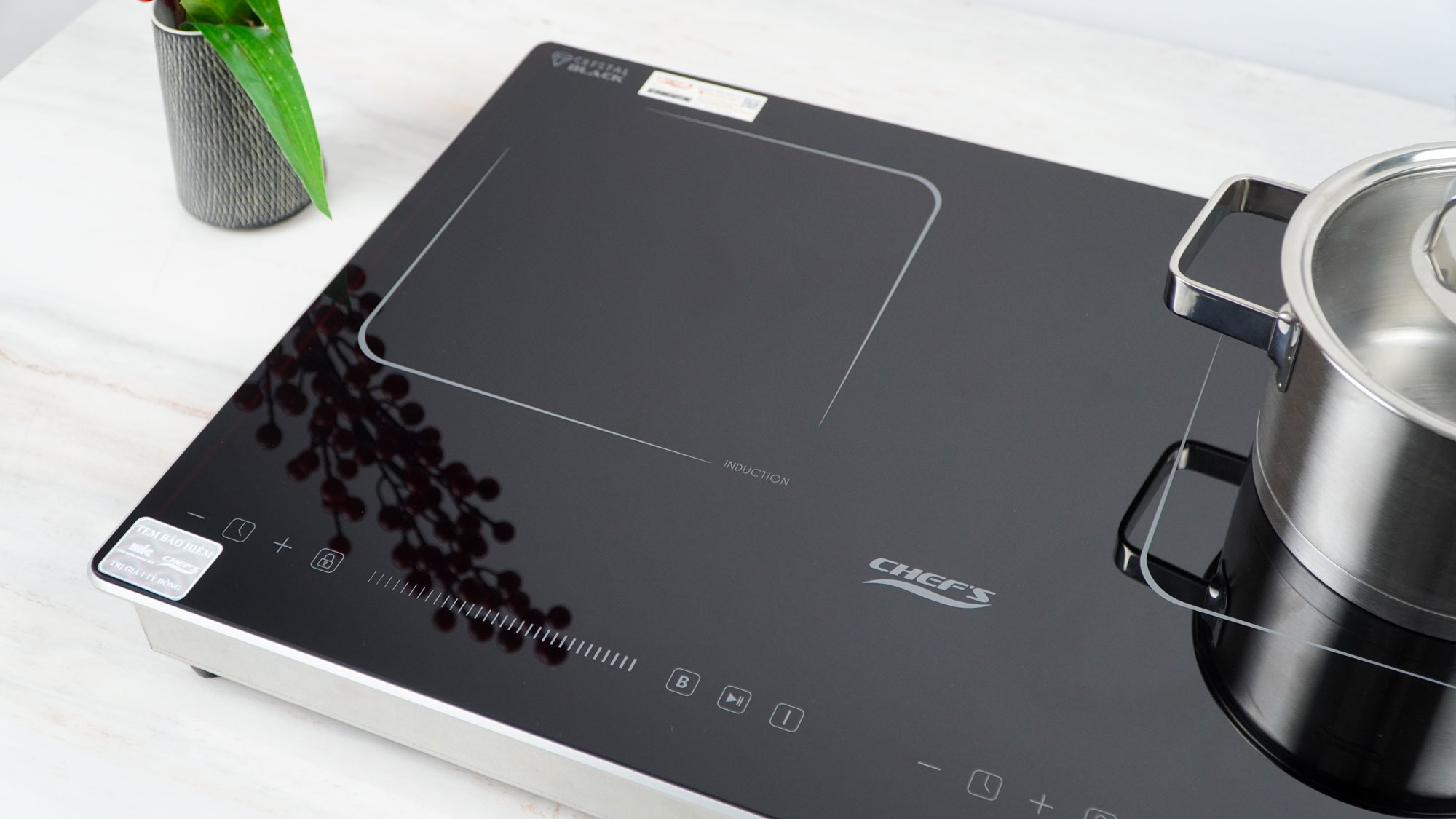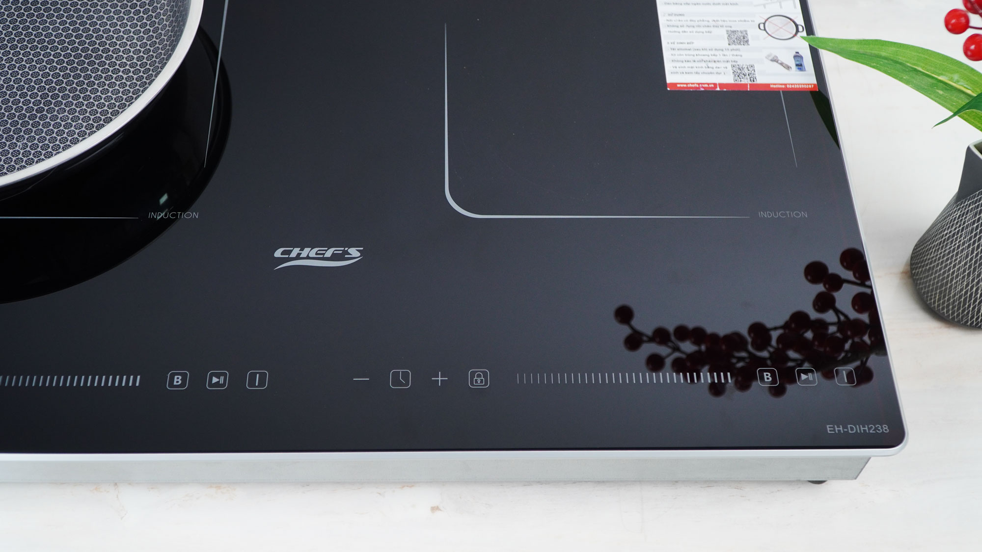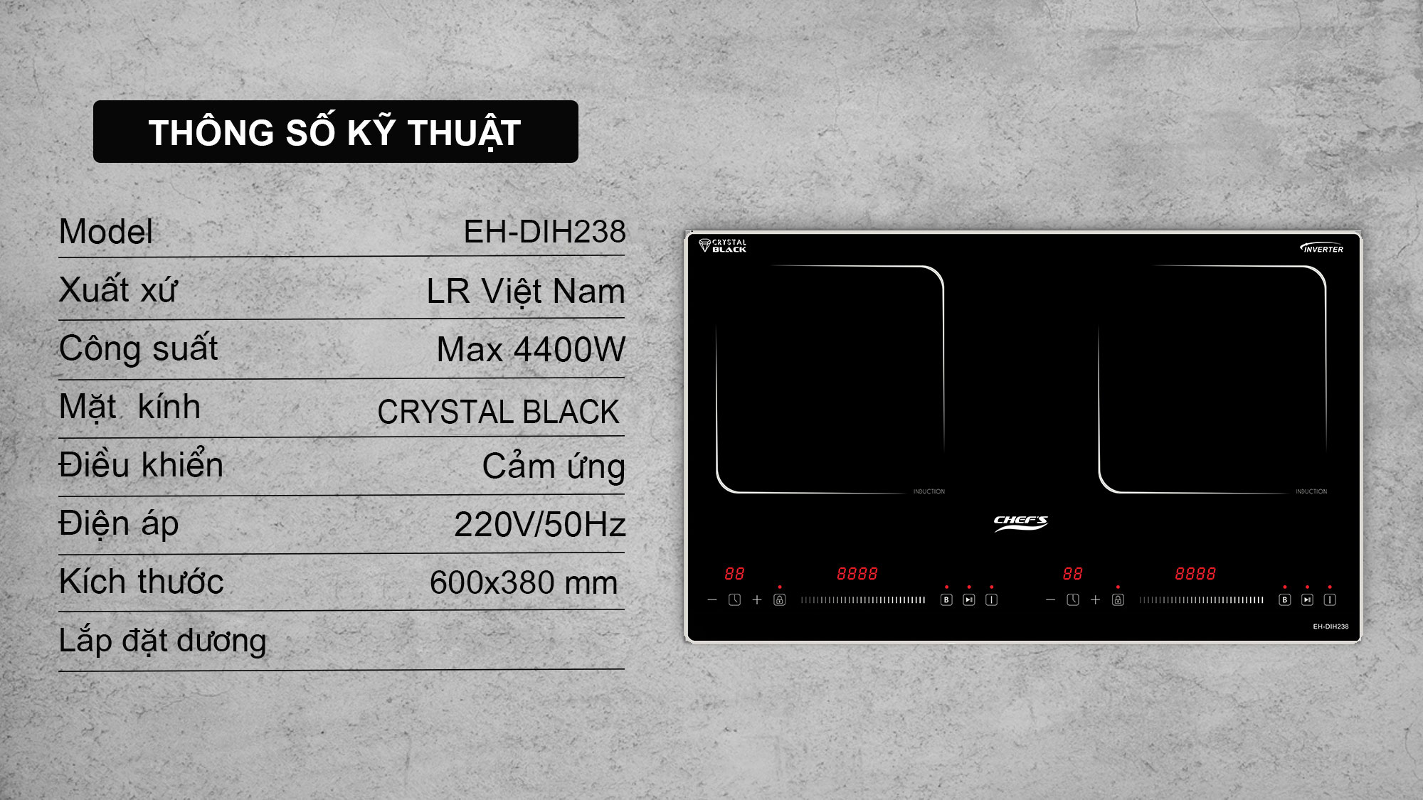 Tháng 5/2025, Chef's cho ra đời model bếp từ 2 vùng nấu EH-DIH238 với thiết kế sang trọng, tinh tế chuẩn Châu Âu. Bếp sử dụng mặt kính Crystal Black siêu bền. Bề mặt kính phẳng, sáng mịn làm nổi bật không gian bếp. Ưu điểm nổi bật của model bếp từ Eh-DIH238 này chính là thiết kế nhỏ gọn, với kích thước chỉ 600x380mm, phù hợp để lắp dương, đây chính là lựa chọn tối ưu cho những gia đình có không gian bếp nhỏ hoặc không muốn cắt đá.