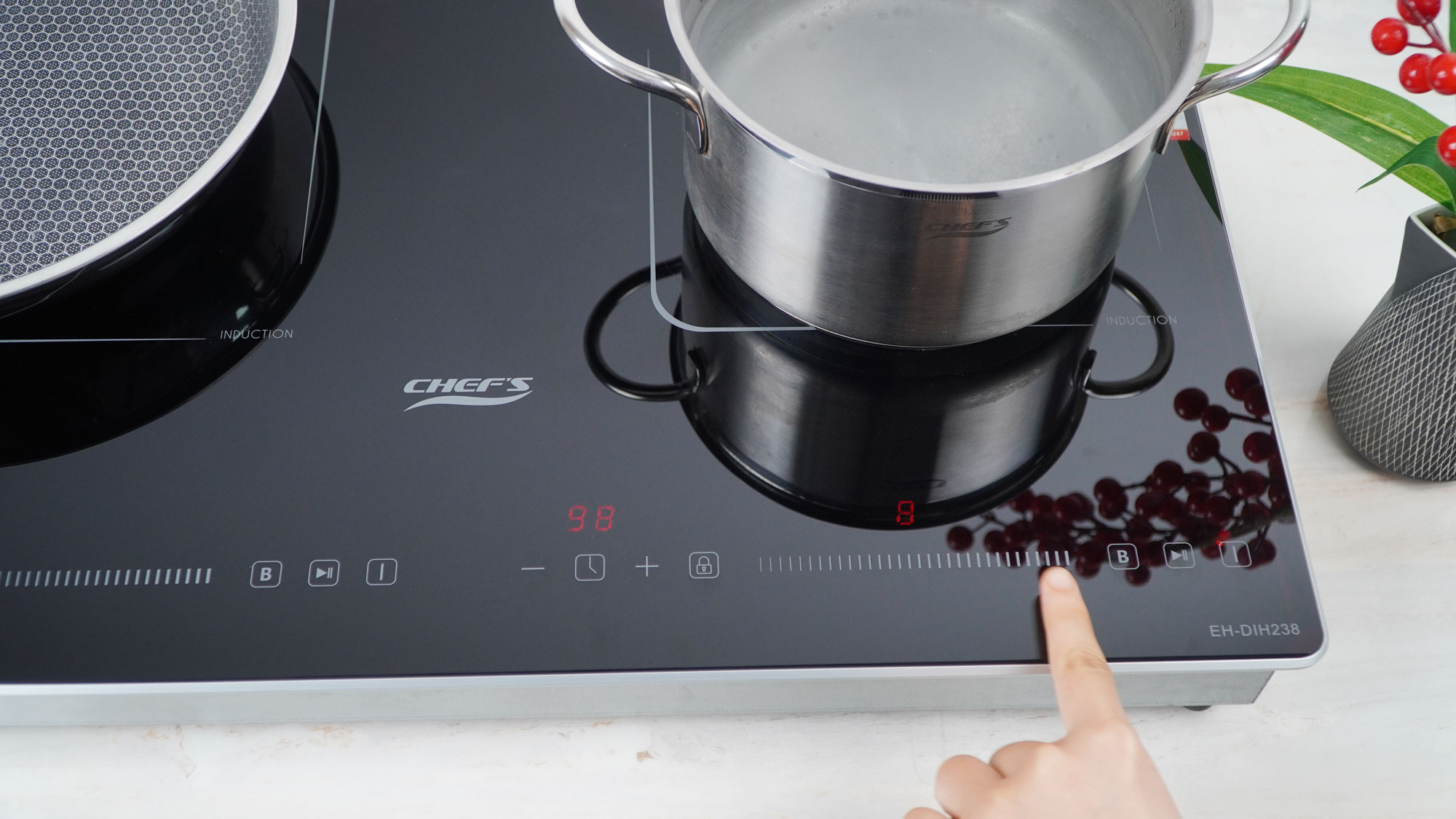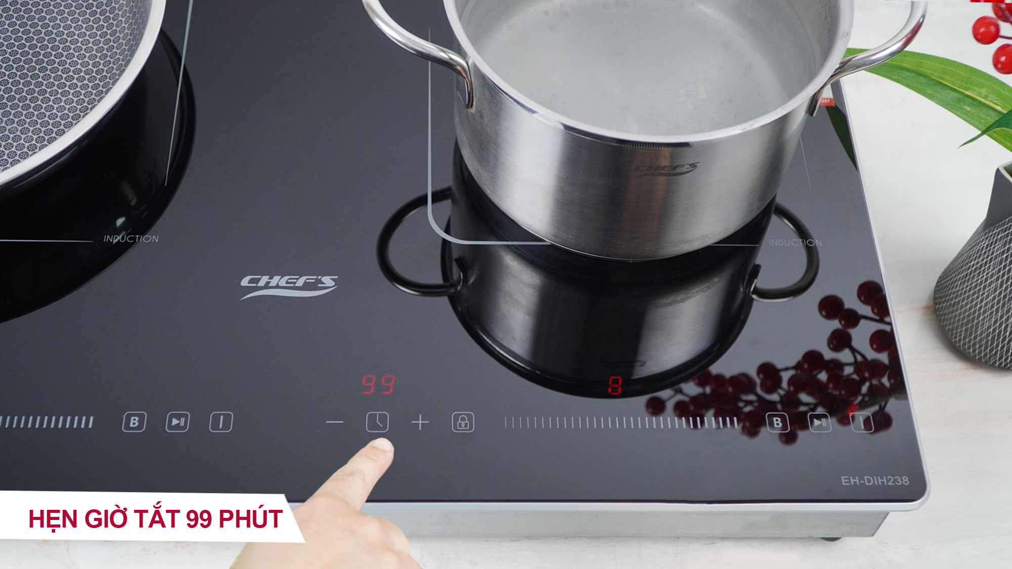 Hẹn giờ: Bếp từ Chef's EH-DIH238 có thể hẹn giờ độc lập cho từng vùng nấu, thời gian hẹn đến 99 phút. Người dùng có thể linh hoạt hẹn giờ nấu cho từng món ăn mà không lo bị quên dẫn đến thức ăn bị quá nhừ hay cháy, khét.