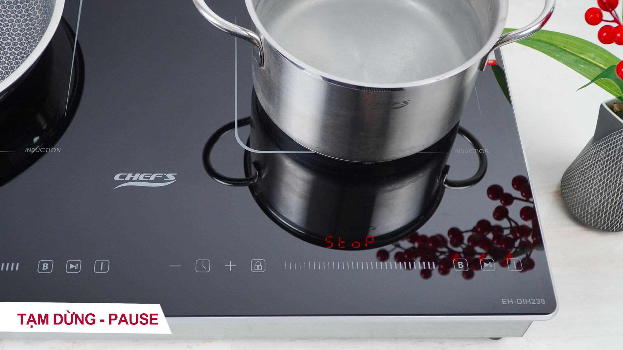 Tạm dừng: Tính năng rất tiện lợi khi người nấu bận nghe điện thoại, mở cửa, nhận hàng.... Khi dừng bếp tạm thời, các chế độ nấu đang dùng sẽ được lưu lại trong bộ nhớ. Tạm dừng sẽ được duy trì trong 1 phút, sau thời gian này, nếu không có thao tác khác trên bếp, bếp sẽ tự động được ngắt.