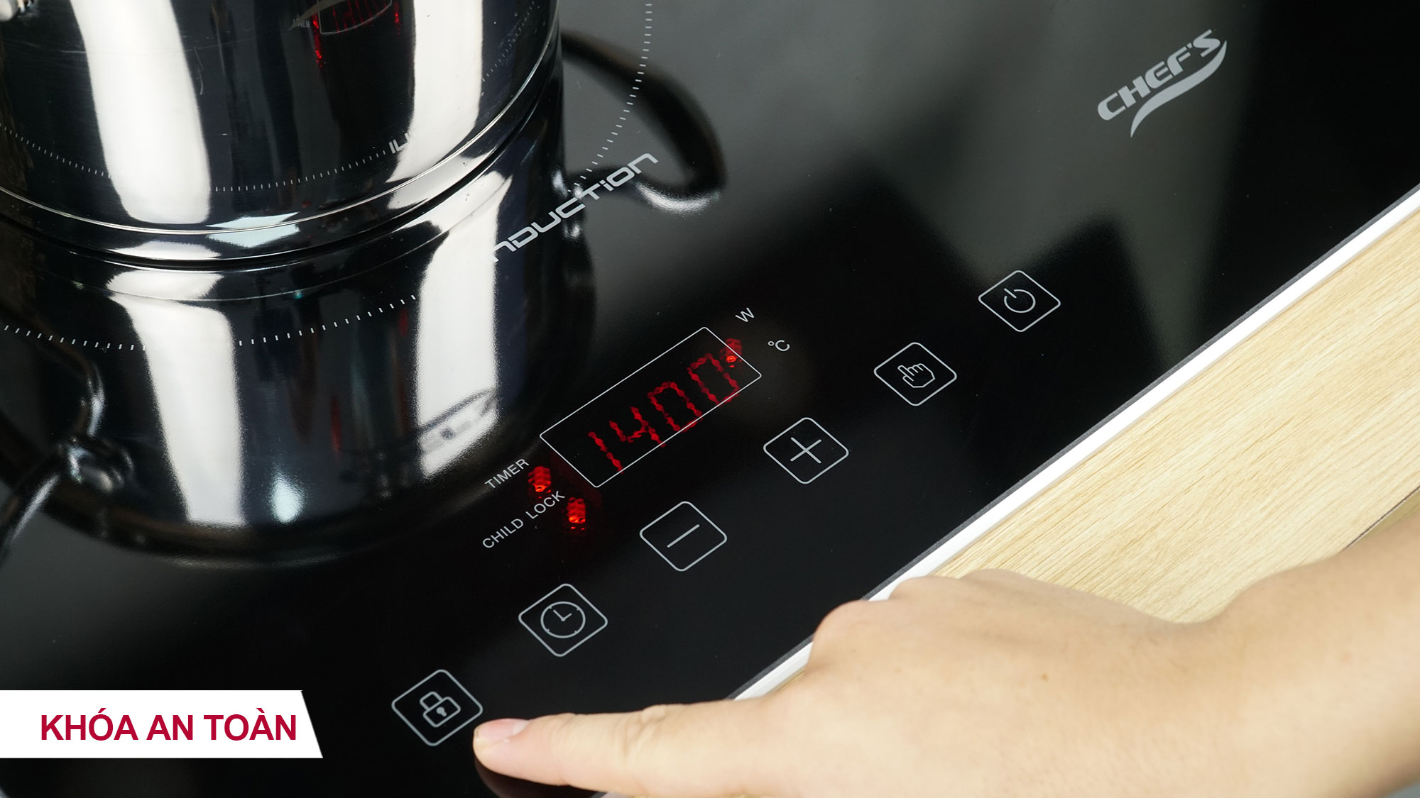 Khóa an toàn Child Lock: Nhấn vào phím khóa 3s để kích hoạt tính năng khóa. Lúc này, các phím trên bếp sẽ bị vô hiệu hóa (chỉ mở nút nguồn và Khóa), người khác, đặc biệt là trẻ em khi vô tình chạm vào bàn phím bếp cũng sẽ không làm thay đổi các chương trình nấu đã được cài đặt. Giữ vào phím khóa 3s để mở lại.