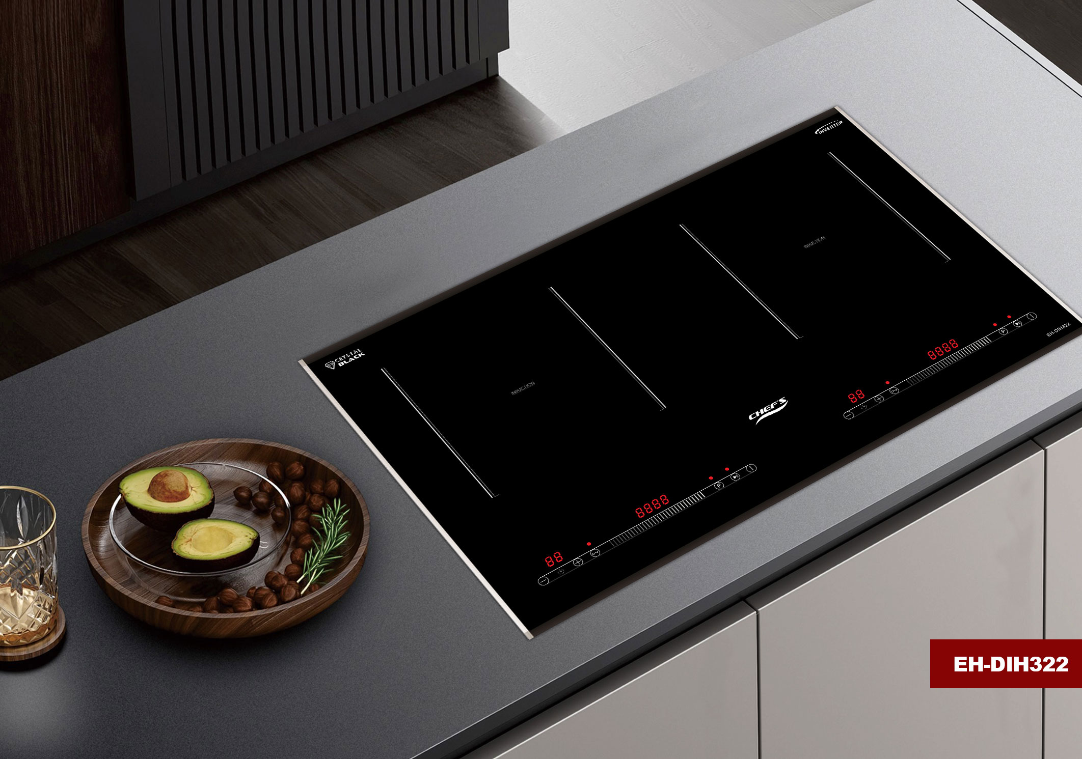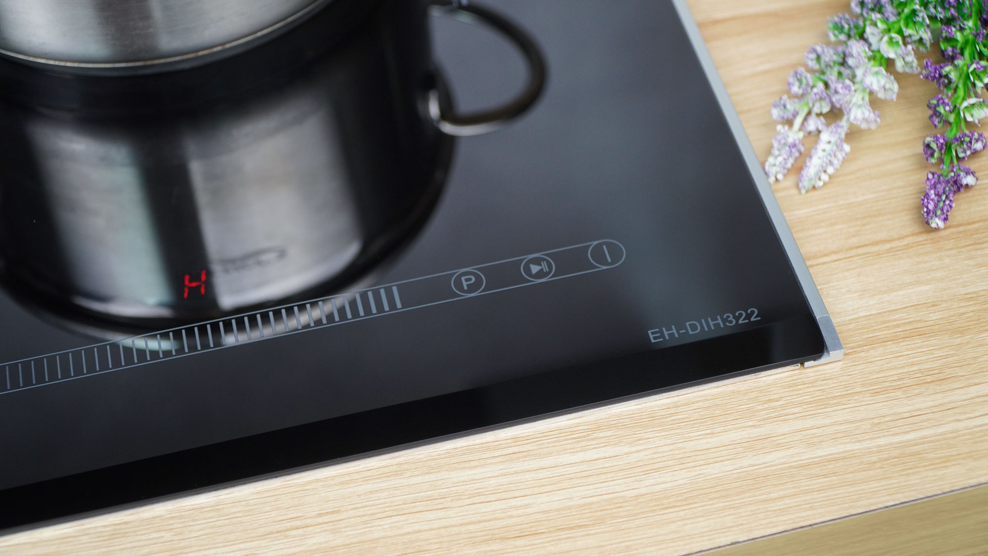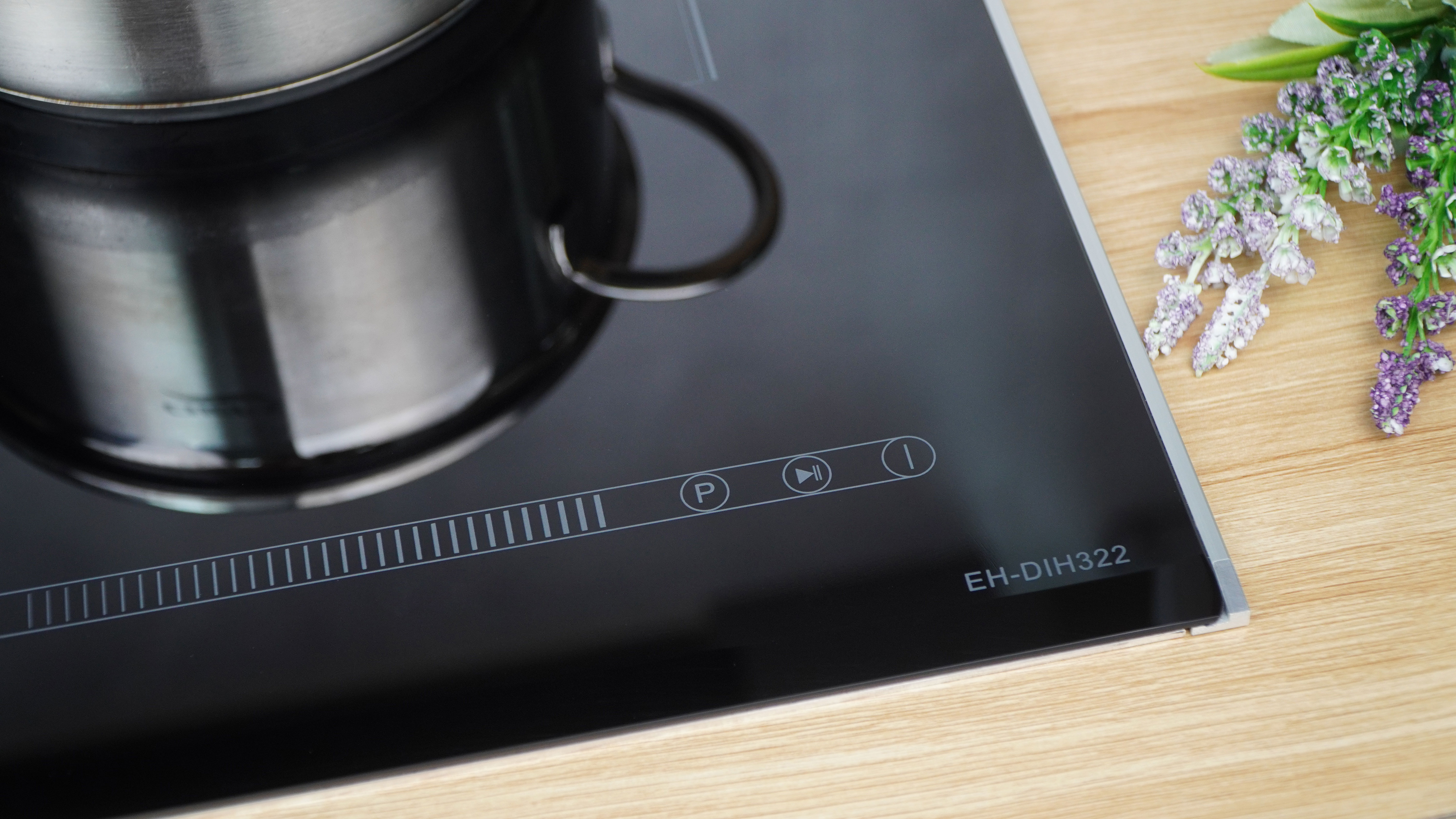 Bếp từ đôi EH-DIH322 thiết kế 2 vùng nấu với 2 bảng điều khiển riêng biệt. Vùng nấu bếp được thể hiện bằng vùng hình vuông với các chấm bi tròn nhỏ màu xám, giúp hạn chế tối đa các vết xước có thể nhìn thấy trên bề mặt kính.