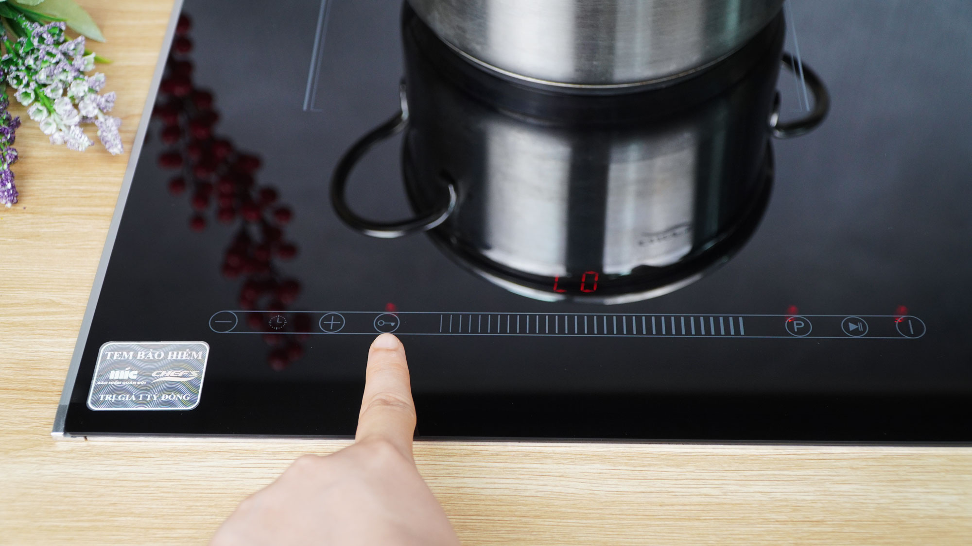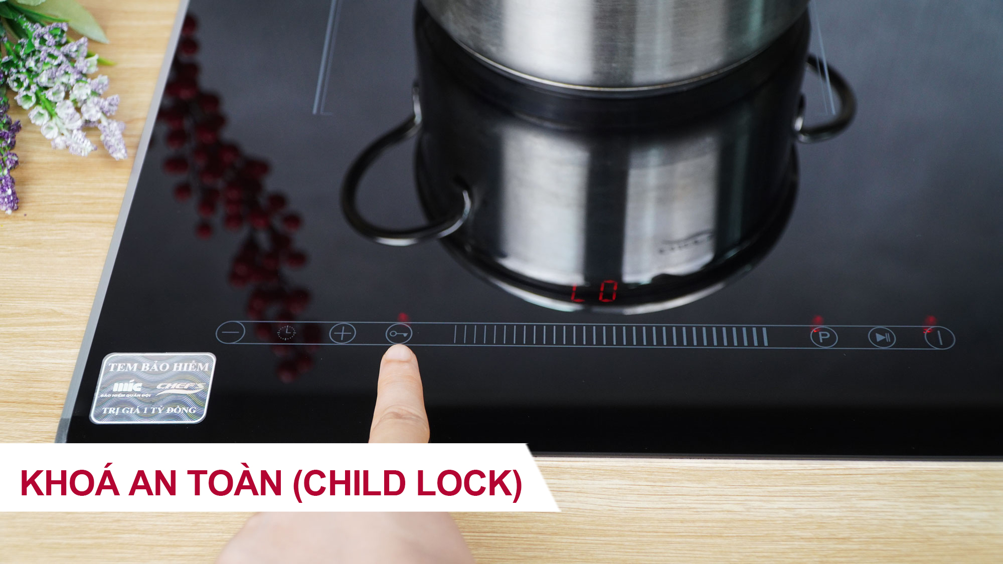 Khóa an toàn Child Lock: Nhấn vào phím khóa 1s để kích hoạt tính năng khóa. Lúc này, các phím trên bếp sẽ bị vô hiệu hóa (chỉ mở nút nguồn và Khóa),khi người khác, đặc biệt là trẻ em vô tình chạm vào bàn phím bếp cũng sẽ không làm thay đổi các chương trình nấu đã được cài đặt.