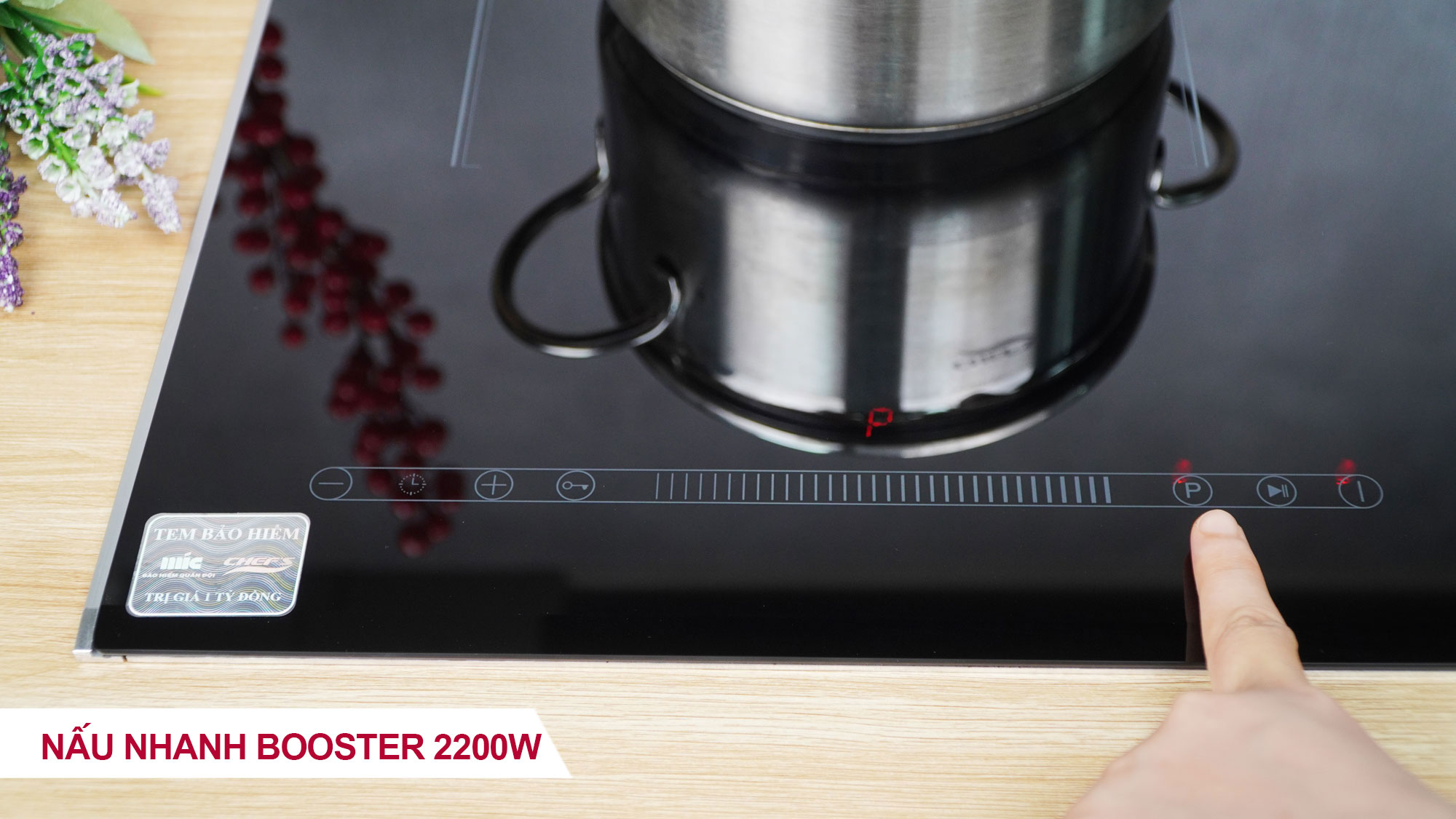 Mỗi vùng nấu bếp có thể điều chỉnh công suất theo mức tăng dần từ 1-8, trang bị thêm tính năng gia nhiệt nhanh Booster với mức công suất tối đa 2200W/1 vùng nấu.