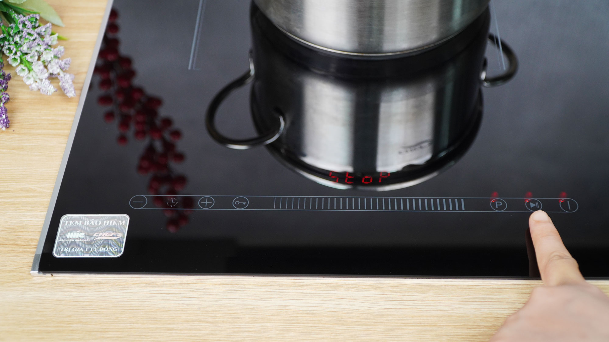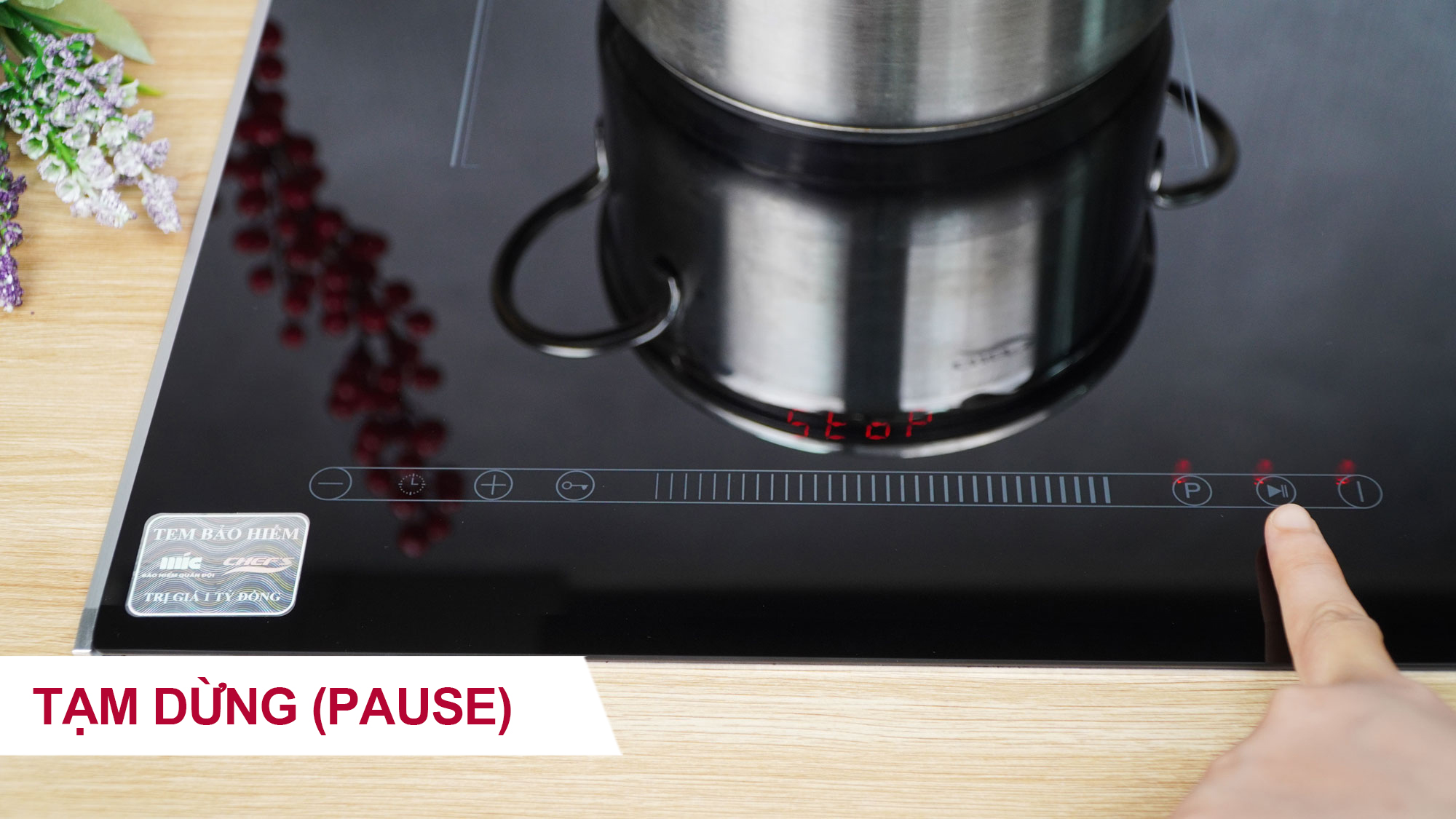 Tạm dừng: Khi đang đun nấu có phát sinh các việc bận như nghe điện thoại, đón khách,..Người dùng có thể bấm Tạm dừng bếp để xử lý, bếp sẽ được ngưng hoạt động tạm thời, sau đó sẽ tắt sau 1 phút nếu như không được bấm để khôi phục hoạt động cho bếp.