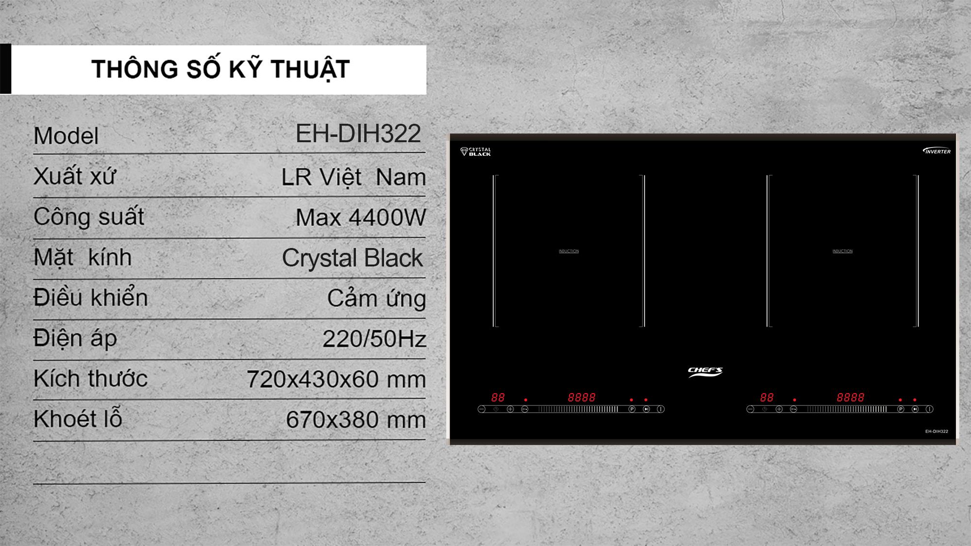 Bếp từ Chef's EH-DIH322 được trang bị các tính năng nấu nướng thông minh và tính năng an toàn khi sử dụng cho bếp và người dùng.