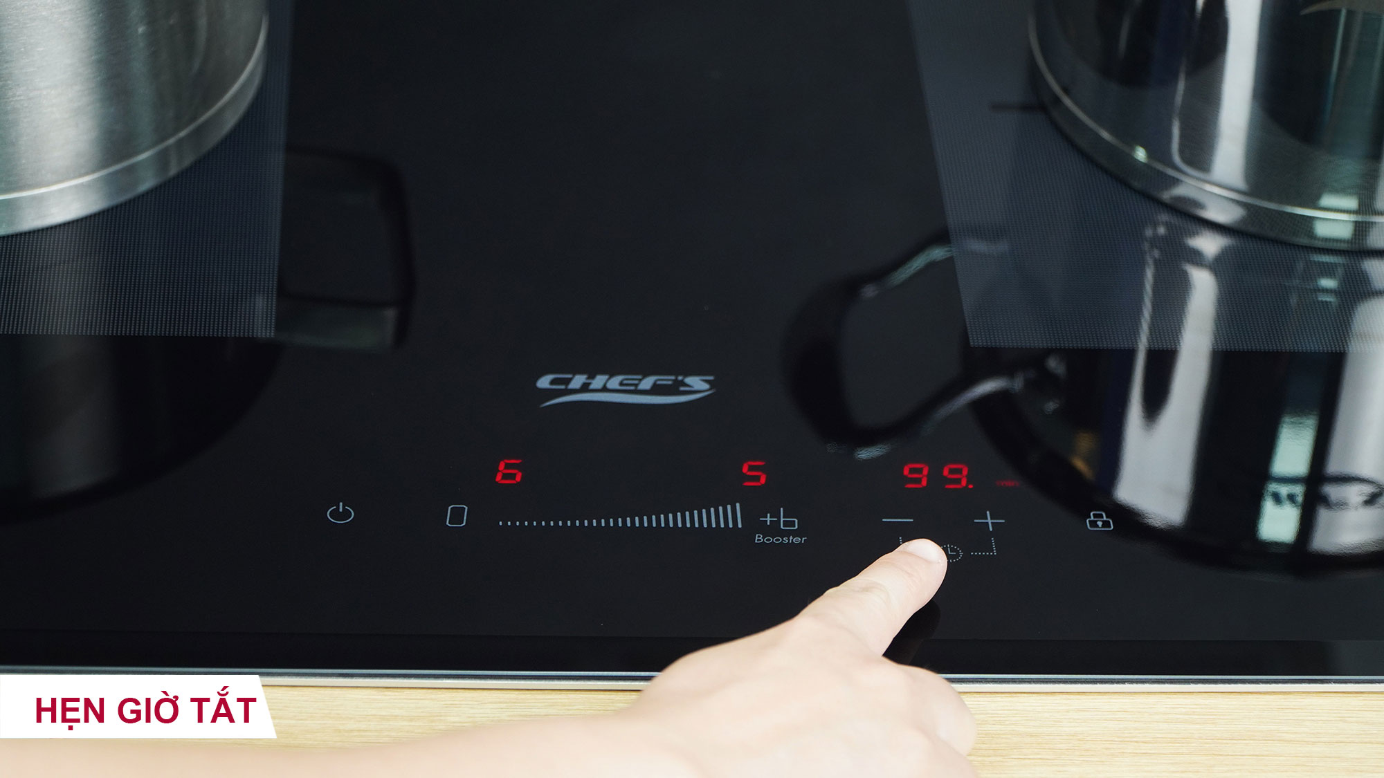 Hẹn giờ: Bếp từ đôi Chef’s EH-DIH328 có tính năng hẹn giờ nấu riêng biệt cho từng vùng nấu, thời gian hẹn đến 9 giờ 30p. Bạn chỉ cần cài đặt thời gian nấu phù hợp, bếp sẽ tự động tắt sau khi hết thời gian hẹn giờ, người dùng có thể chủ động nấu nướng mà không phải canh chừng, lo thức ăn bị cháy, khét.