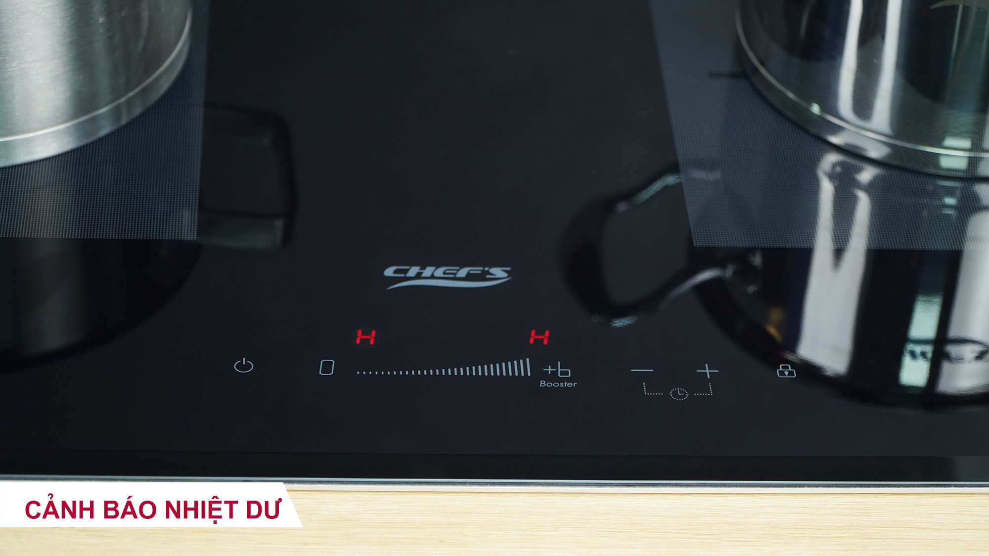 Cảnh báo nhiệt dư: Sau khi sử dụng, nếu vùng nấu mặt bếp còn nóng, màn hình LED sẽ hiển thị chữ H để cảnh báo để người dùng không chạm tay vào mặt bếp gây bỏng. Khi nhiệt độ mặt bếp giảm xuống mức an toàn, đèn báo chữ H sẽ tự động tắt.