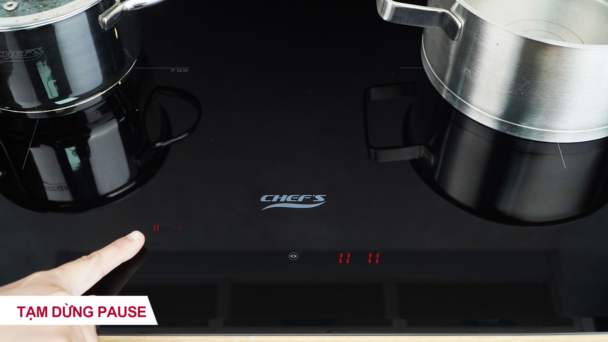 Sau khi được kích hoạt, phần công suất của từng vùng nấu sẽ không hoạt động. Các chức năng của bếp sẽ được lưu giữ vào bộ nhớ. Chức năng Pause được duy trì trong thời gian 10 phút. Sau thời gian đó, bếp sẽ tự tắt nếu không được khôi phục hoạt động.