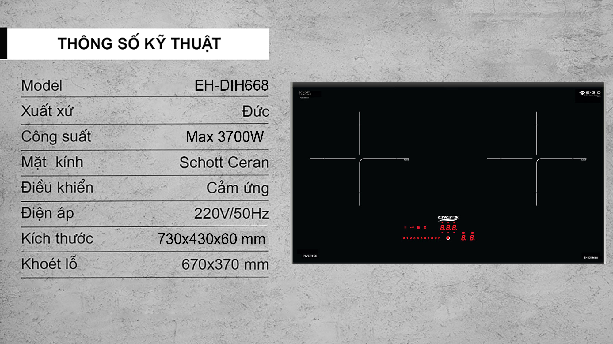 Với linh kiện được nhập khẩu từ hãng E.G.O - Đức, khách hàng sử dụng EH-DIH668 luôn an tâm về chất lượng sản phẩm. Bếp được ứng dụng công nghệ Inverter thông minh vượt trội, giúp tiết kiệm điện năng tới 30%.