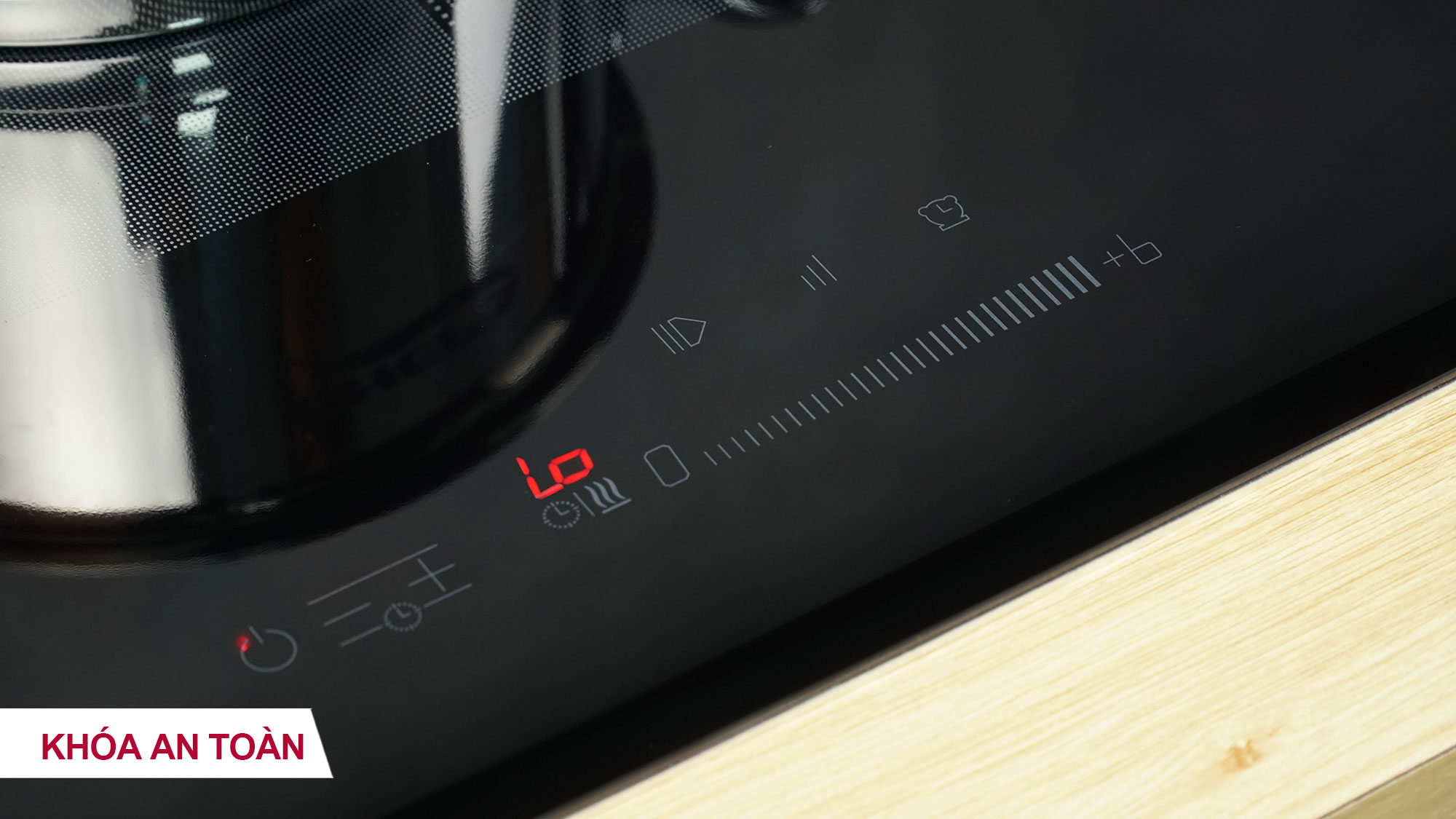 Khóa an toàn Child Lock: Sau khi tắt nguồn bếp, tiếp tục chạm và giữ vào phím nguồn 2s để kích hoạt tính năng khóa. Lúc này, các phím trên bếp sẽ bị vô hiệu hóa (chỉ mở phím nguồn đồng thời cũng là phím Khóa), người khác, đặc biệt là trẻ em khi vô tình chạm vào bàn phím bếp cũng sẽ không làm thay đổi các chương trình nấu đã được cài đặt. Sau khi bật bếp, giữ vào phím nguồn 2s để mở lại.