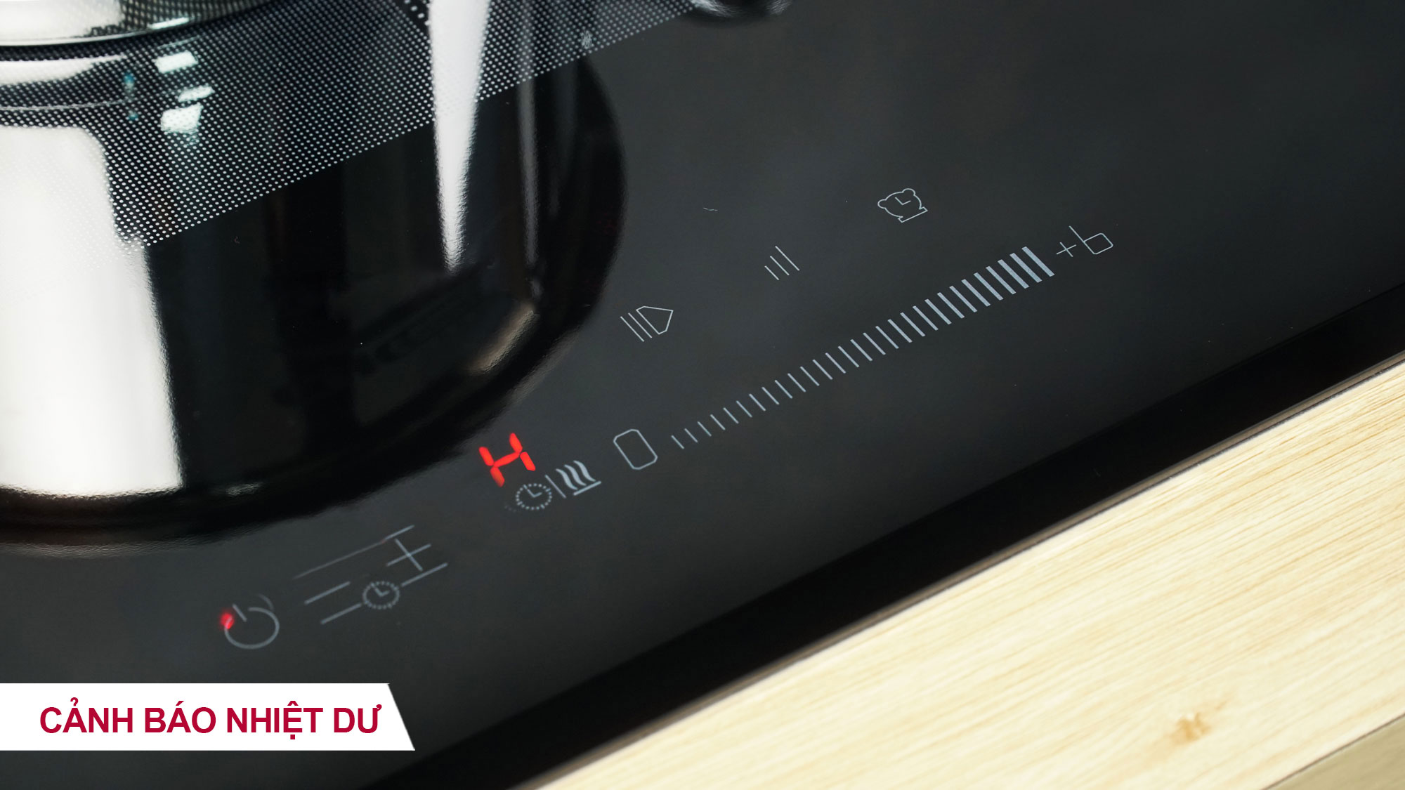 Cảnh báo nhiệt dư: Sau khi sử dụng, nếu vùng nấu mặt bếp còn nóng, màn hình LED sẽ hiển thị chữ H để cảnh báo để người dùng không chạm tay vào mặt bếp gây bỏng. Khi nhiệt độ mặt bếp giảm xuống mức an toàn, đèn báo chữ H sẽ tự động tắt.