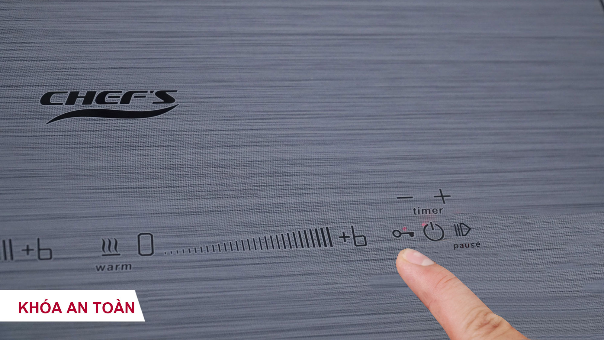 Khóa an toàn Child Lock: Nhấn vào phím khóa 1s để kích hoạt tính năng khóa. Lúc này, các phím trên bếp sẽ bị vô hiệu hóa (chỉ mở nút nguồn và Khóa). Tính năng này được ứng dụng tiện lợi đặc biệt là trong những nhà có trẻ em.