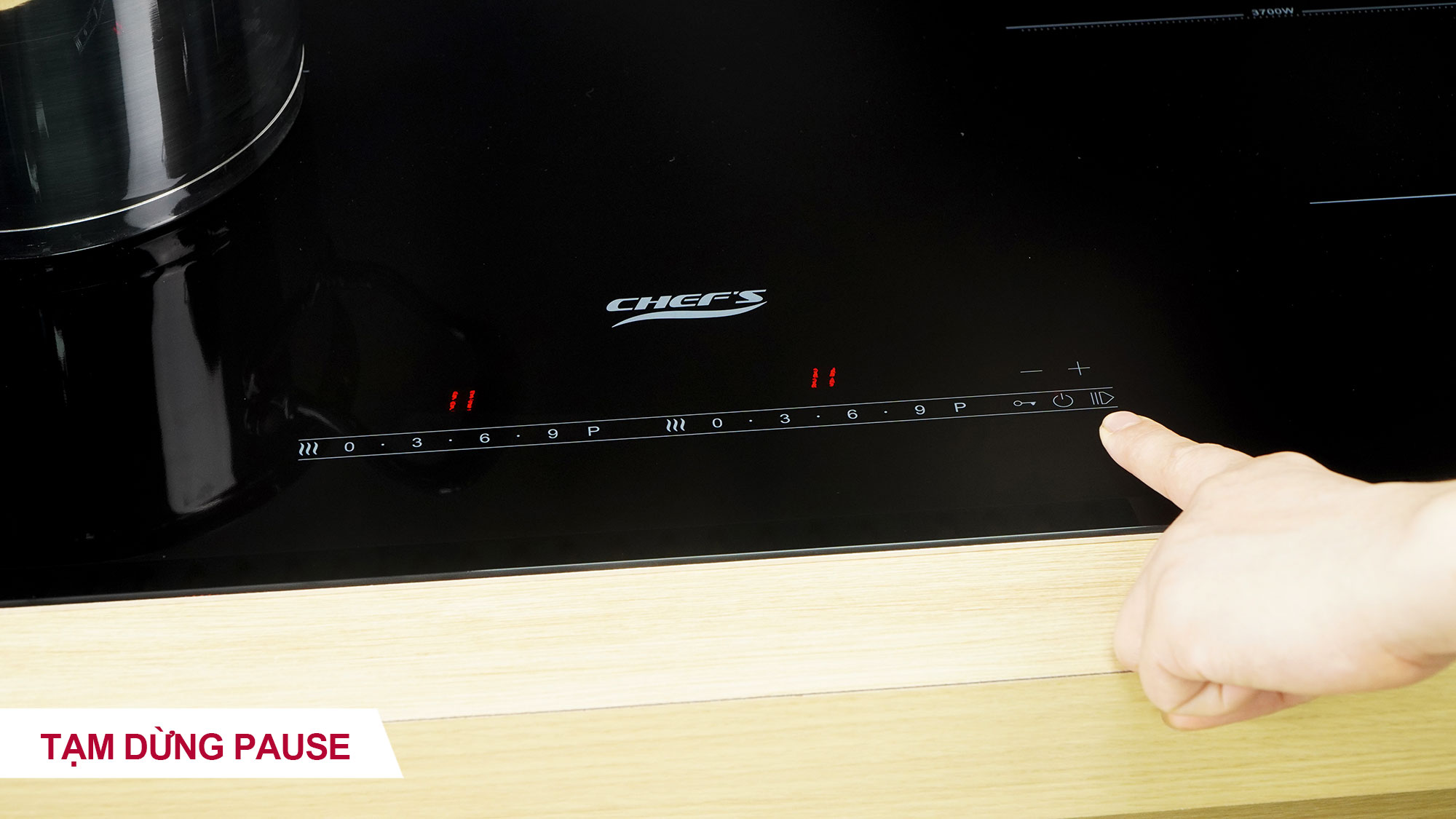 Dừng bếp tạm thời Pause: Trong khi bếp đang tạm dừng, phần công suất của từng vùng nấu sẽ không hoạt động. Các chức năng của bếp sẽ được lưu giữ và bộ nhớ. Bếp sẽ tạm dừng trong khoảng 10 phút. Sau thời gian đó, bếp sẽ tự tắt nếu không được khôi phục hoạt động.