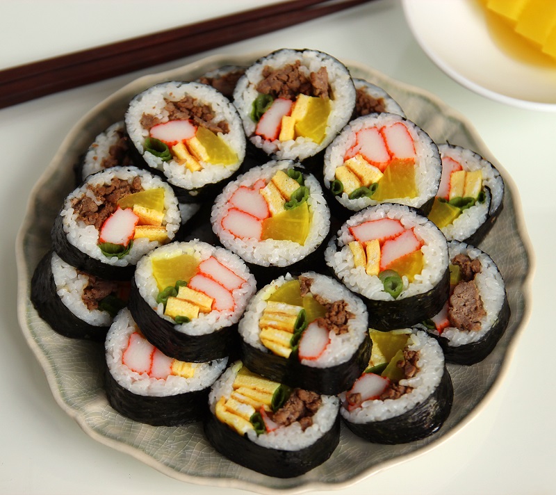 – Dưa leo, cà rốt, trứng chiên và lá rong biển.