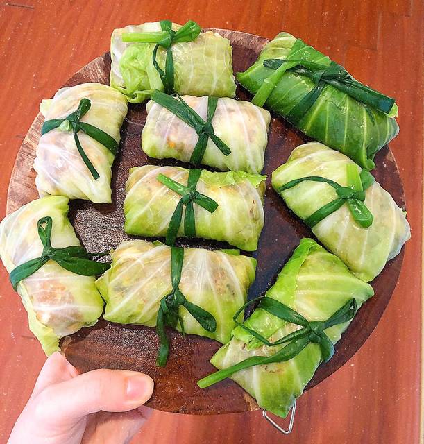 – Đặt chảo lên bên từ, bật bếp và điều chỉnh mức công suất 6, đợi cho chảo nóng thì bạn cho dầu oliu vào, đổ hành đã băm sẵn vào xào cho vừa chín tới. Tắt bếp, cho hành ra, đợi bớt nóng bạn trộn với hỗn hợp thịt, trứng, gia vị đã chuẩn bị từ trước đó. Tiếp đó, bạn vớt lá bắp cải ra cho ráo nước chuẩn bị cuộn. Đặt lá bắp cải vào đĩa hay thớt có mặt phẳng, sau đó cho nhân vào và cuộn tùy theo chiều thuận của tay. Chú ý cuộn được 1 nửa thì bạn gấp mép của lá bắp cải vào, thao tác này giúp cho cuộn được đẹp và chắc chắn hơn.