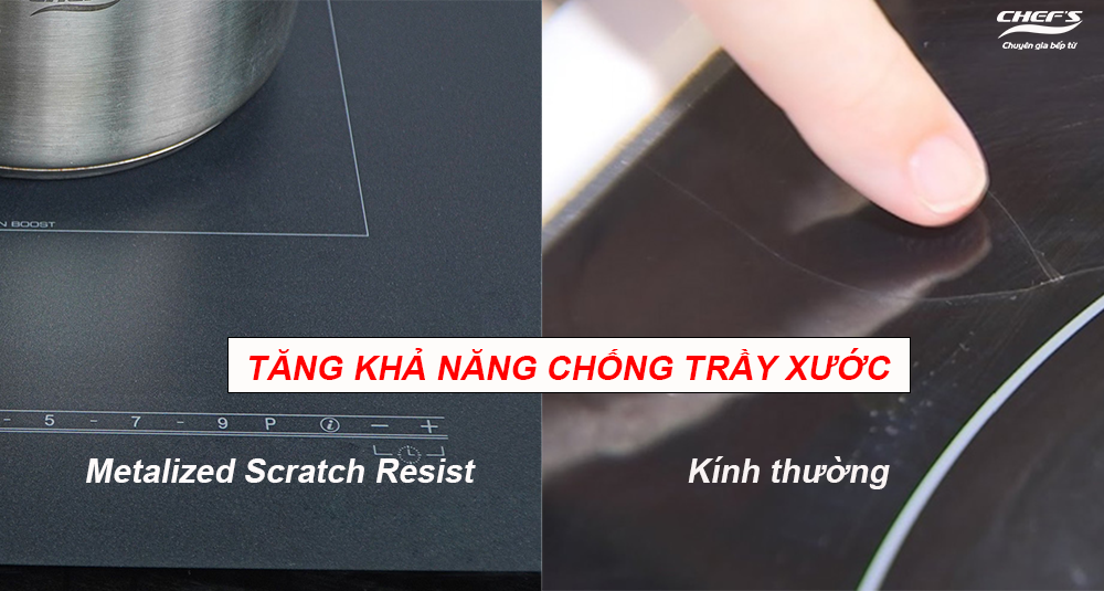 Mặt kính Metalized Scratch Resist được thiết kế để hạn chế tối đa các vết trầy xước phát sinh trong quá trình nấu nướng. Những thao tác kéo xoong nồi, ma sát nhẹ hay vật dụng vô tình trượt qua bề mặt đều khó để lại dấu vết. Nhờ đó, sau thời gian dài sử dụng, bếp vẫn duy trì được vẻ sáng bóng và nguyên vẹn như lúc mới mua, giữ cho gian bếp luôn sang trọng và sạch đẹp.